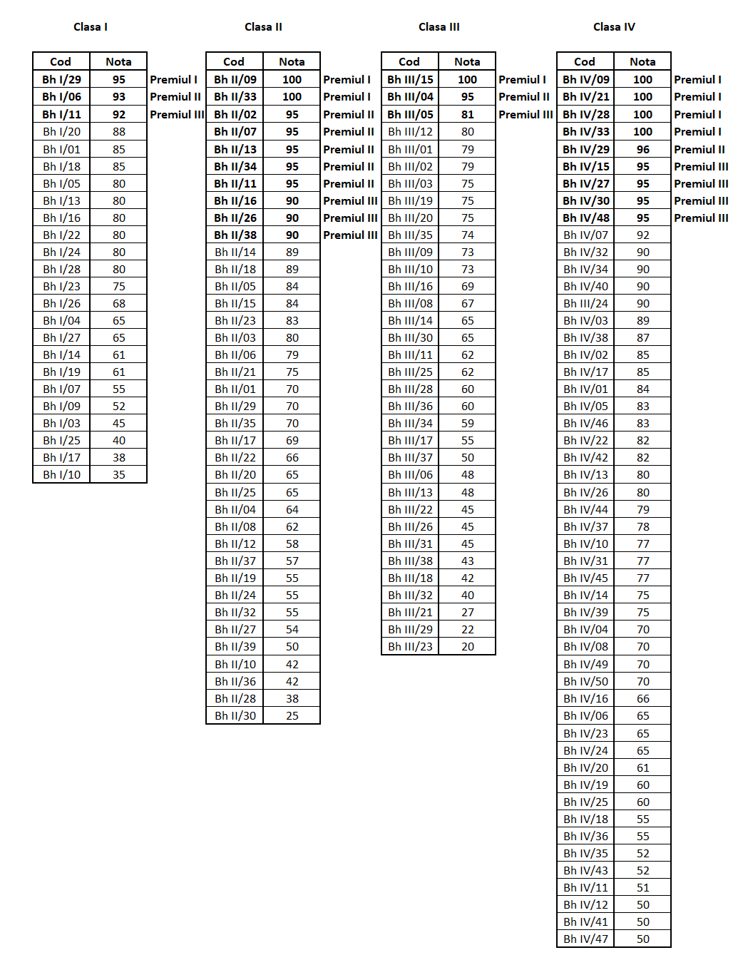 * Premiile nu se acordă pentru rezultate mai mici de 60 puncte.